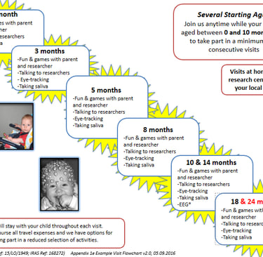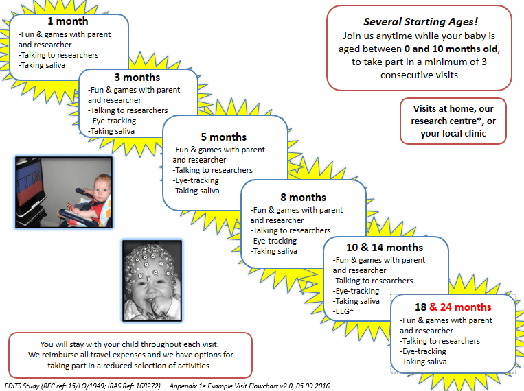 The EDiTS study infant phase involved a range of assessments that were carried out in the family home and in our research centre in London. Below you will find an outline of the assessments we conducted between the ages of 3 months to 24 and/or 36 months.